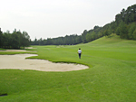パーを取るのはもっとも難しいミドルです。いかに飛ばし屋でも、右に見えるバンカー群を越えるのは容易ではありません。はまったら最後。へたすると出すだけです。