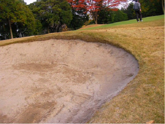 どうしても池だけは避けたかったので右のバンカー方向へ。